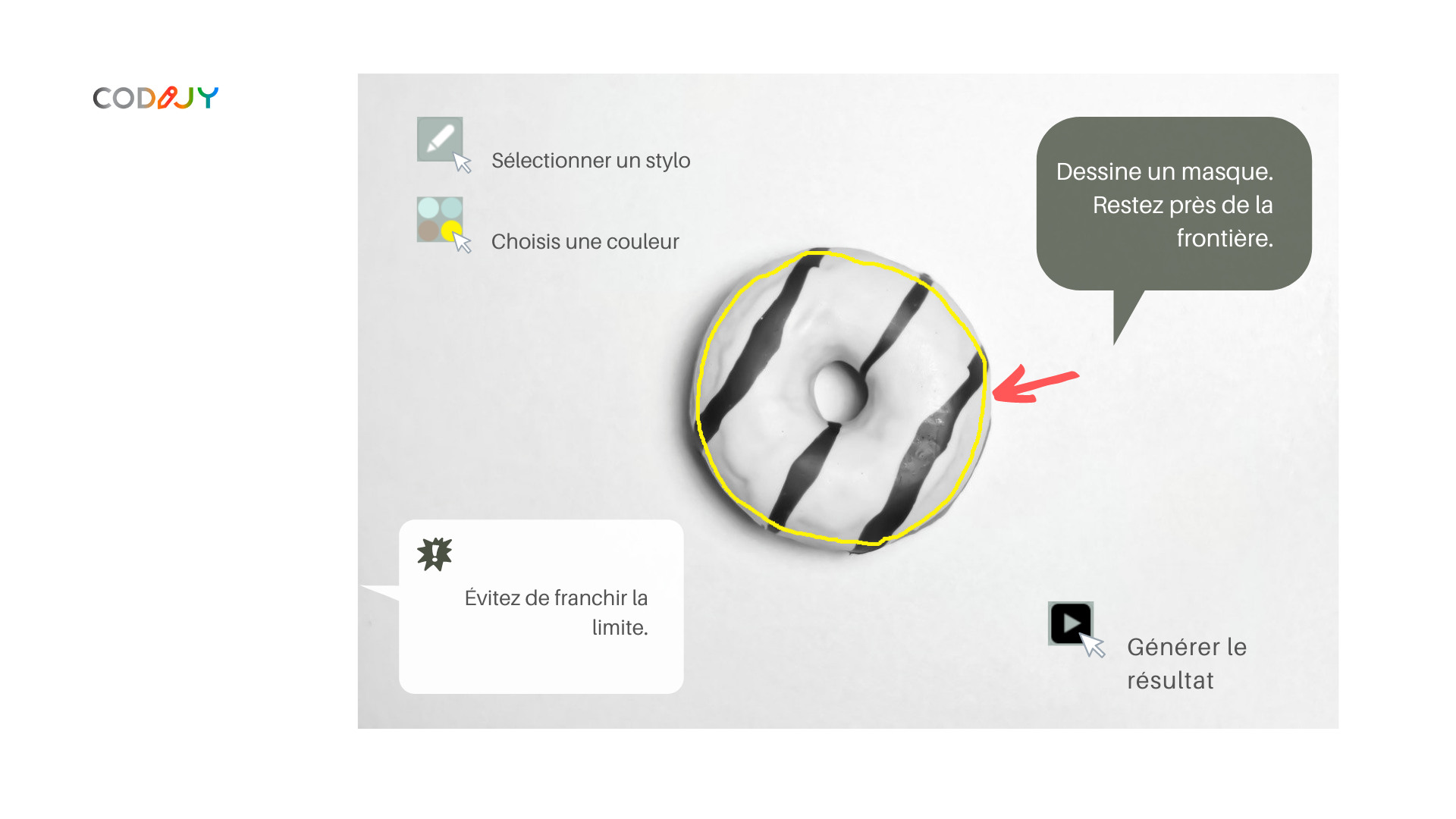 CODIJY utilise une technique de coloration des plus intuitives – les traits ou masques de couleur. Ils transmettent les instructions de couleur aux algorithmes du programme.
